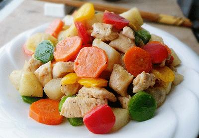4.按顺序往锅里放鸡肉、山药、胡萝卜翻炒。