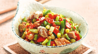 1、牛里脊肉洗净切成细丁用料酒、1茶匙盐、生粉腌制片刻,蒜薹洗净切成半厘米长的小丁。