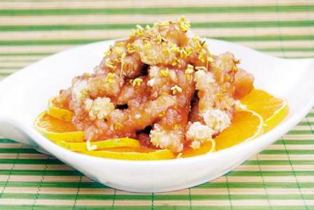 5、原锅留油适量,倒入蜂蜜和桂花翻炒均匀,然后将刚炸好的鸡柳倒入翻炒几下即可。