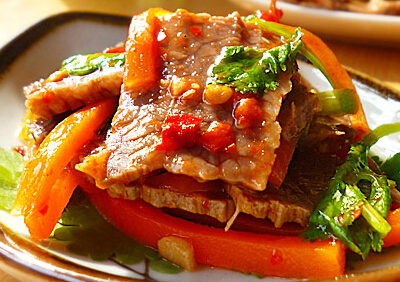 材料:牛肉(适量)、胡萝卜(适量)、香菜(适量)、辣椒酱(适量)、料酒(适量)、麻油(适量)