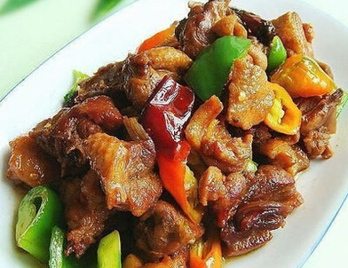 材料:鸭肉:(半只)、红椒(适量)、青椒(适量)、老姜(150g)
