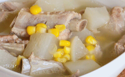 主料:排骨 (两条)、白萝卜 (一个)、玉米粒 (适量)