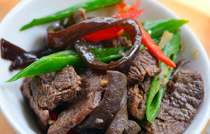 材料:牛肉400克、木耳180克、青椒、红椒1根、红尖椒1个、生姜适量、大蒜适量;
