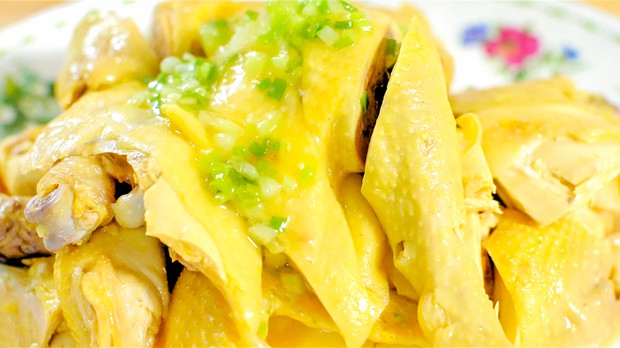 6、将鸡从冰水里捞出控干水分切块,吃前蘸葱油味汁即可。