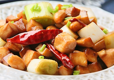 2、将切好的鸡丁用盐、料酒和淀粉拌匀腌制片刻;起锅倒油,把花生米凉油下锅小火炒脆后放凉备用。