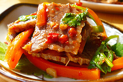 材料:牛肉 (适量)、胡萝卜 (适量)、香菜 (适量)、辣椒酱 (适量)、料酒 (适量)、麻油 (适量)