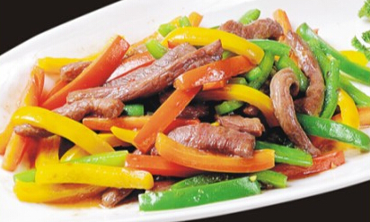 6、牛肉呈粉红色时就放入彩椒,翻炒几下,加入一小勺大牛肉粉,半小勺盐翻,炒均匀出锅。