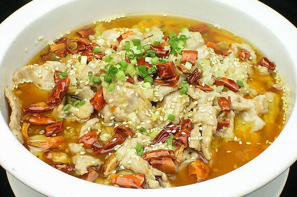 7. 用剩余的植物油烧开,淋在肉片上,使热油把干辣椒、花椒粉、肉片再炸一下,即可使麻、辣、浓香四溢。
