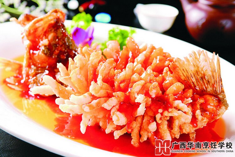 桂鱼200克,料酒2克,松子10克,胡椒粉少许,番茄酱10克,植物油 500克,湿淀粉40克 ,食盐适量,食醋 15克。