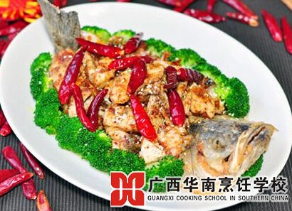 5、锅下油,油温到5成热时,下入鱼片滑熟;捞出沥油;盘中摆放鱼头、鱼尾、鱼肉和鱼骨,用熟西兰花围边;