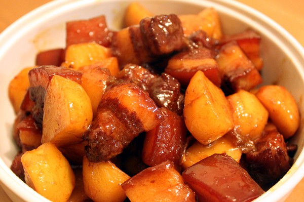 材料:猪肉350克、土豆3个、葱15克、姜10克、蒜5瓣、花生油30毫升、盐2克、料酒15毫升、老抽10毫升、生抽15毫升、白糖20克、醋5毫升、八角1枚、胡椒粉2克、味精2克。