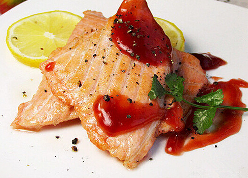 5.然后把煎好的三文鱼片摆盘,淋上甜辣酱即可。