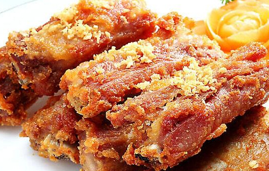 6、煎炸至表面金黄,用筷子轻松地戳穿排骨的肉后,说明排骨已经熟了,装盘即可。