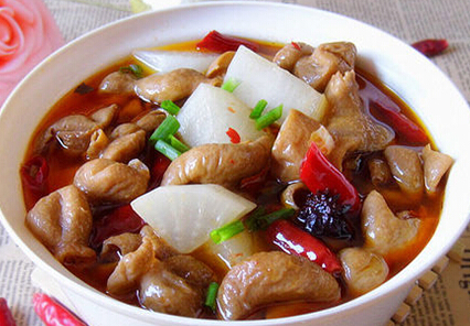 材料:猪肥肠、白萝卜、辣椒酱、大蒜、生姜、八角、桂皮、茴香、干辣椒、干花椒、白酒、盐、蚝油。