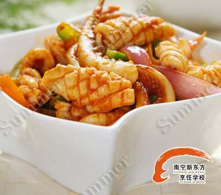 下鱿鱼须翻炒,最后打芡出锅即可。