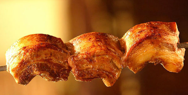 3、最后一到工序是在肉表面稍稍刷一点调稀的蜂蜜再烤一下就可以了;上桌的时候先用片刀将肉表面的酥香表皮切下来,然后再放烤炉上继续烤制,一直重复这道工序,直到吃完为止。