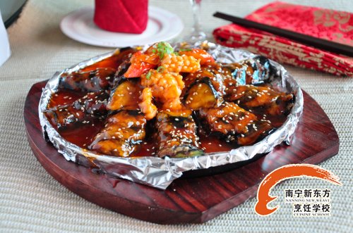 5、炒锅中放少许油,将洋葱和胡萝卜丁下锅煸香,分别加入一勺蚝油、番茄酱和海鲜酱油调味,然后将水淀粉倒入,用铲子翻炒均匀成微稠的汤汁,将焯好的虾仁等放入翻炒,,然后放入玉子豆腐翻炒均匀;南宁新东方烹饪 www.gxhnpr.com