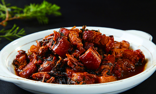 8、最后下入梅干菜,蒜粒翻炒均匀,淋少许水在焖煮10~15分钟