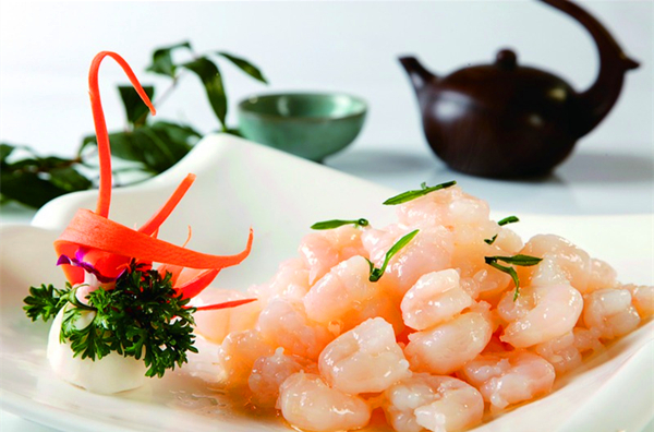 原料:活大河虾1000克、龙井新茶1.5克、鸡蛋1个、绍酒1.5克、精盐3克、味精2.5克、淀粉40克、熟猪油1000克(约耗75克)