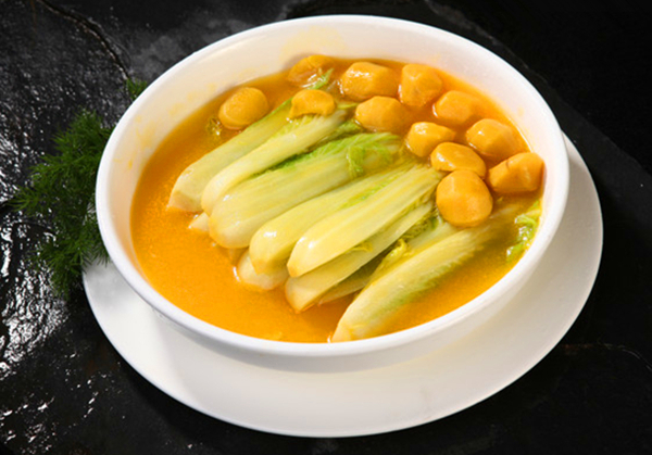 原料:鸡汤1碗、栗子200克、白菜2棵、盐、水淀粉