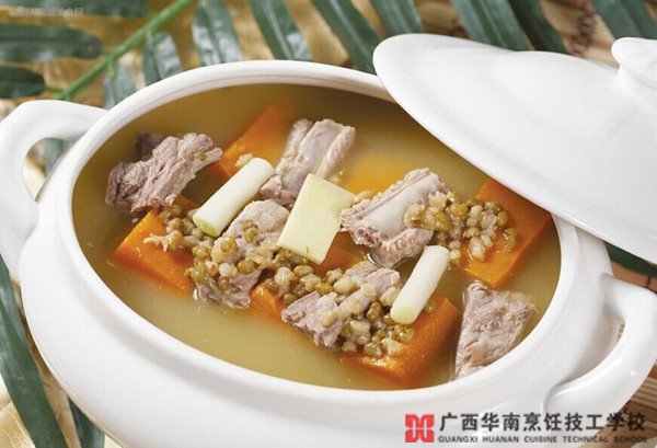 食材:猪排骨(大排)100克、南瓜200克、绿豆20克、盐适量