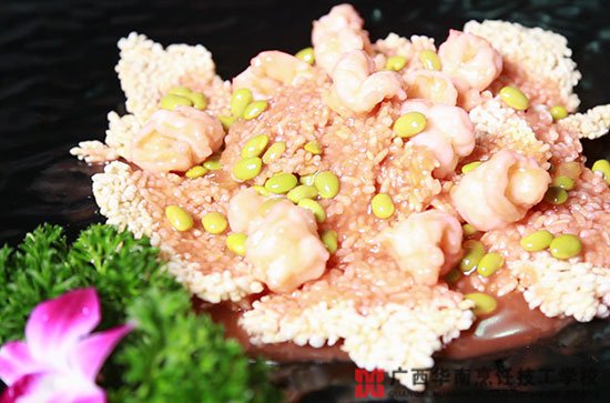 主配料:鲜虾仁、锅巴、西红柿、毛豆;