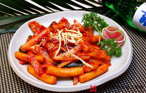 1.辣白菜(泡菜)切成小块,葱切段,姜切丝备用;年糕切成条状,在开水中煮一下捞出沥干;