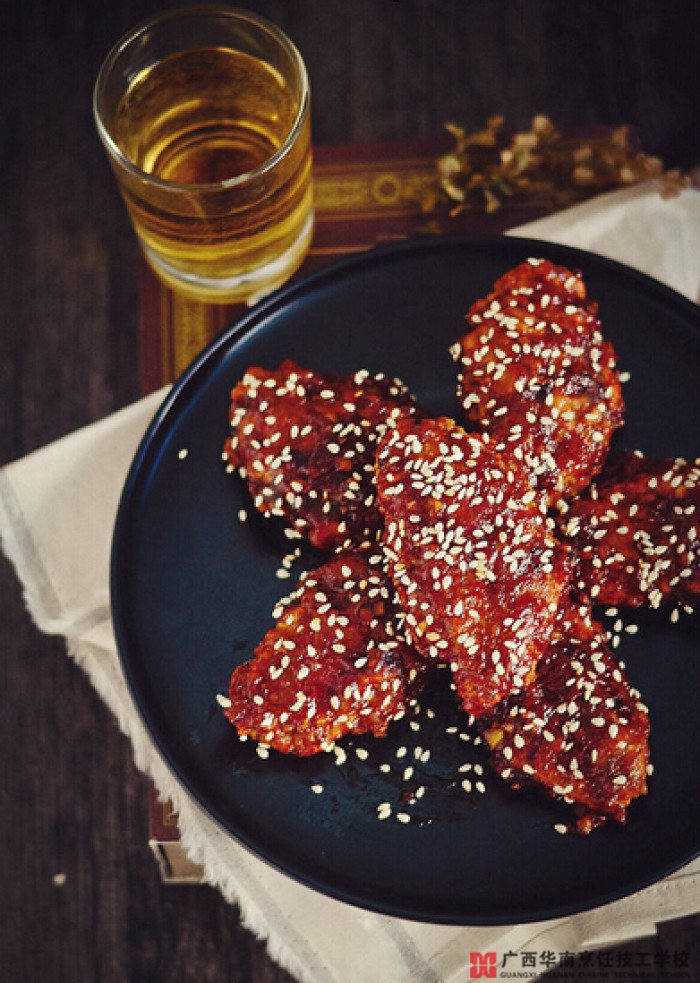 5、将辣酱搅拌至浓稠时倒入鸡翅,均匀裹上酱料,后撒上一把香芝麻,拌匀即可。