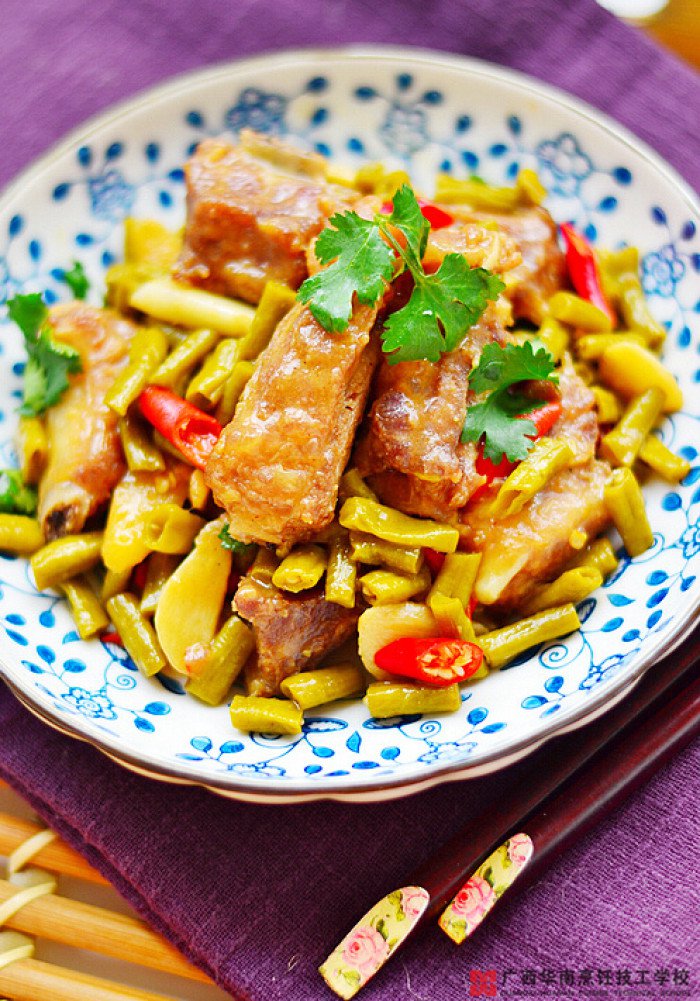 原料:酸豆角60g,排骨400g,红椒3个,蒜2瓣,姜1小块,香菜适量