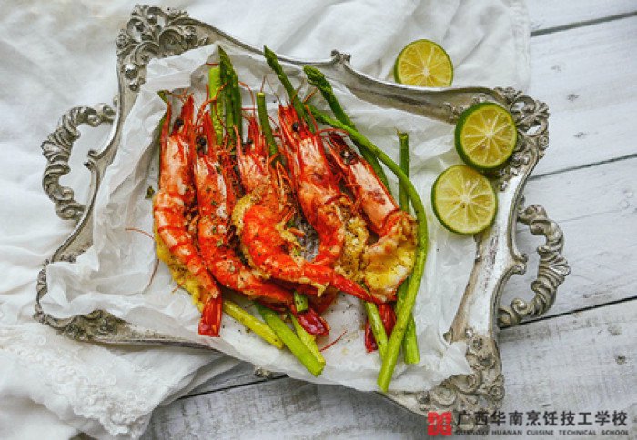 材料:海虾、芦笋、柠檬、黑胡椒、海盐、橄榄油、蒜、干百里香碎