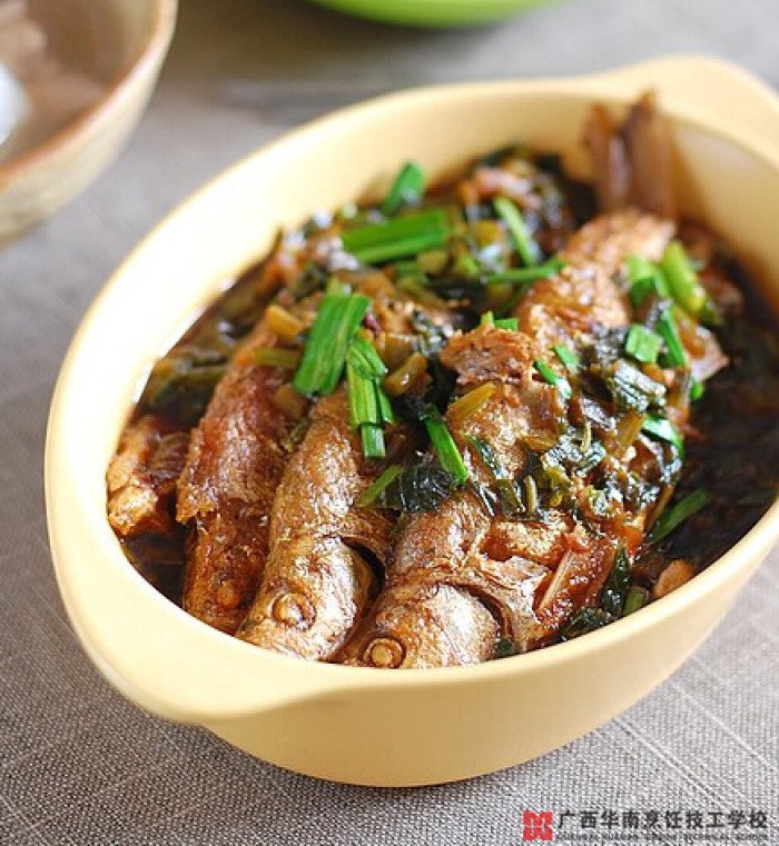 7、倒入雪菜,中火烧至鱼入味即可,出锅时撒入大蒜即可。