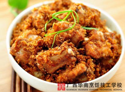 5、腌好的排骨均匀沾裹上一层打碎的米粉