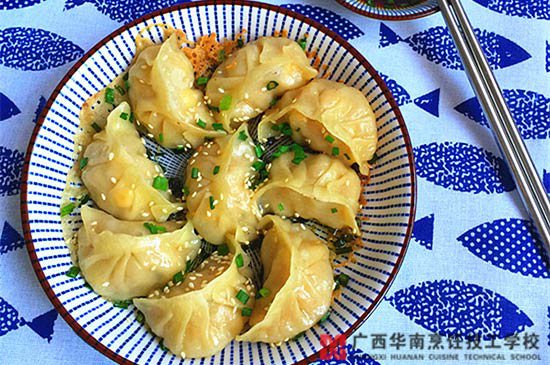 9.煎至饺子定型5分熟时,倒入淀粉水,煎至底部焦脆时,撒葱末,熟芝麻即可出锅。
