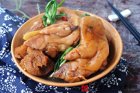 6.香喷喷的猪蹄炖熟了,连汤汁一起倒入炒锅,加入姜丝葱段。