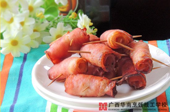 6.撒少许黑胡椒粒,卷起来,用牙签固定好.