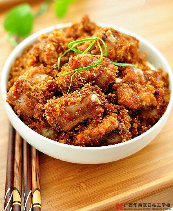 5、腌好的排骨均匀沾裹上一层打碎的米粉;
