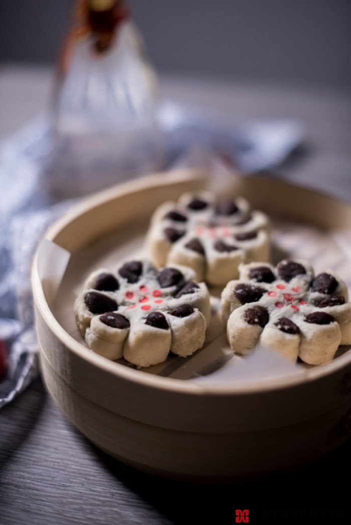 6、再次按扁、擀长、翻面、卷起、两头捏起,擀圆,包上枣泥,用刀子割8下,然后放到烤盘中,将每一个瓣翻出来,用小指在中间处点上红印。