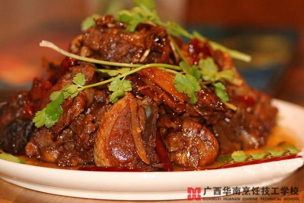 5、放入鸭肉翻炒至浅金黄色。