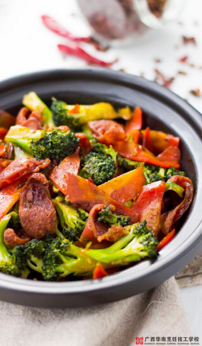 材料:腊肠100g、西兰花150g、胡萝卜1根、葱1段、蒜2瓣、姜2片、花椒15粒、豆瓣酱1茶匙、豆豉酱1茶匙、生抽1茶匙、糖1茶匙