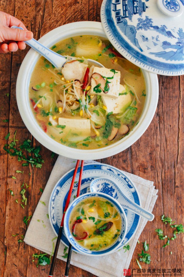 汤: 2汤匙油、1-2片姜、新鲜香菇蘑菇切片、6片红辣椒干(可选)、少量绿豆芽、4杯鸡汤、1/2杯水、小白菜、1/2块豆腐切块、1/2茶匙芝麻油、盐、葱花香菜切碎