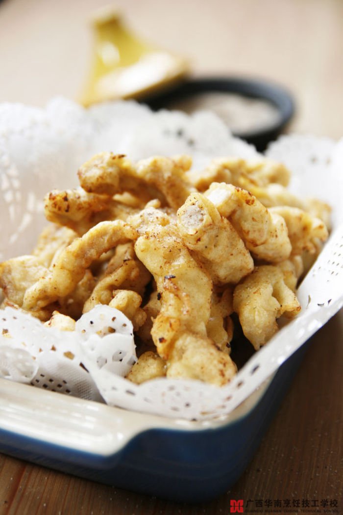 7、锅内油重烧热后,将里脊条倒入复炸至金黄后捞出,蘸椒盐食用。