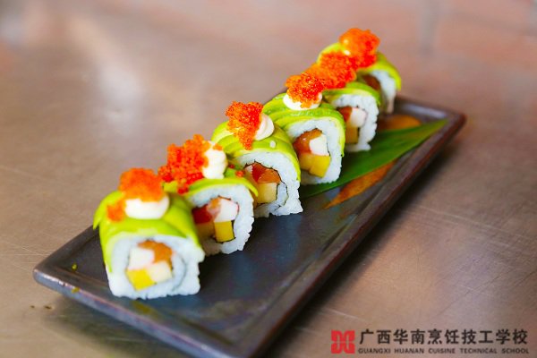 主料:粳米2杯、水适量、寿司海苔2张、三文鱼适量、玉子烧适量、牛油果1个、蟹籽适量。