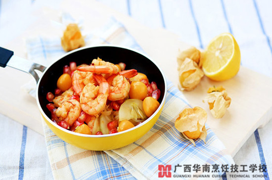 做法:1、鲜虾去皮去头,水黄瓜去皮切半圆片,石榴和灯笼果剥去外皮;