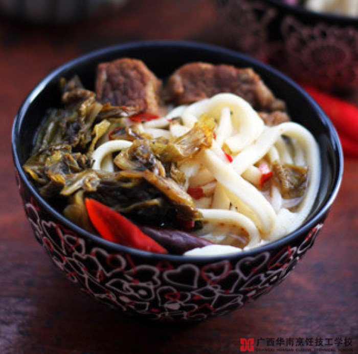 6、面条煮熟,捞出浇上酸菜和牛肉,在浇适量炖牛肉酸菜的汤即可。