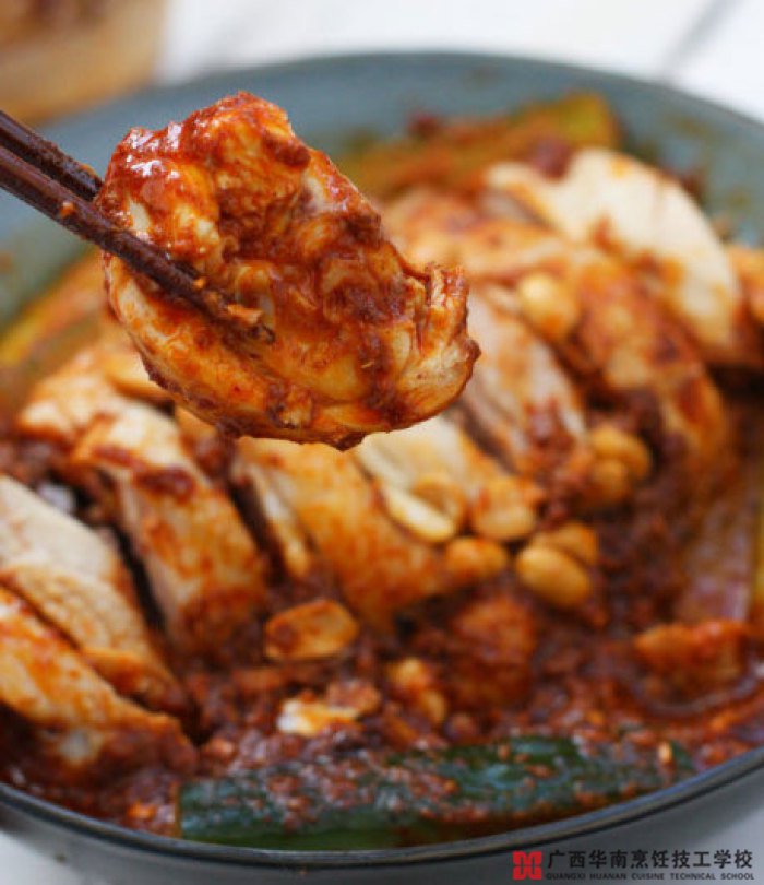 5、将红油、麻酱汁按1:1的比例混合,如果太稠加少量凉开水,将调好的酱汁浇在鸡肉上,后在表面撒上熟花生仁即可。