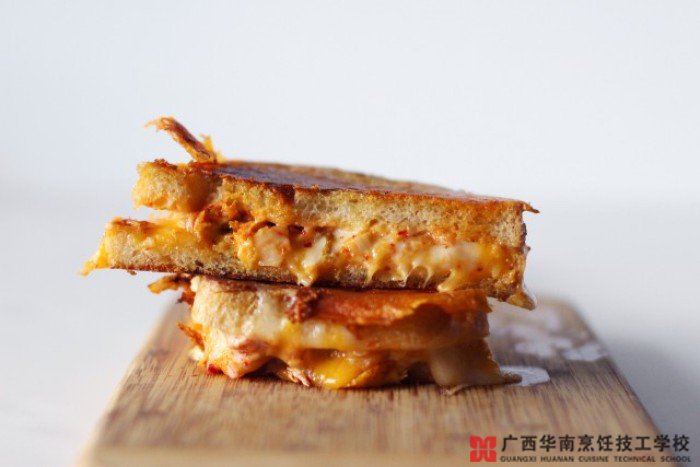 材料:两片面包片, 2汤匙泡菜,1汤匙盐黄油,几片薄干酪片和一把碎干酪。