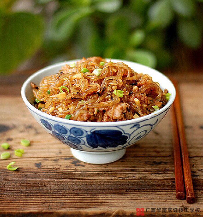 材料:红薯粉丝,肉末,青蒜,嫩笋,干香菇