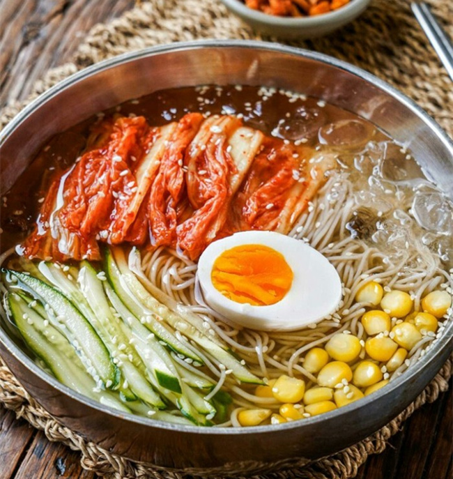 8、冰镇好的冷面团成面团,放在一只大碗里,黄瓜丝、梨丝、泡菜、牛肉片、半个鸡蛋依次摆放到上面,再把冷藏好的肉汤倒入即可。
