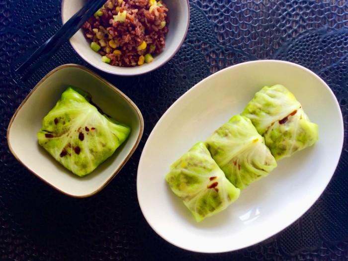 4、在软包菜叶上放上适量的炒饭,先把靠近根的那里叠上,再把上面的部分叠下来;