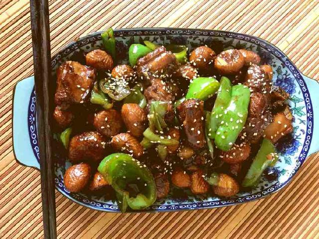 1. 尖椒和甜椒切薄小块,葱切段,板栗去皮。